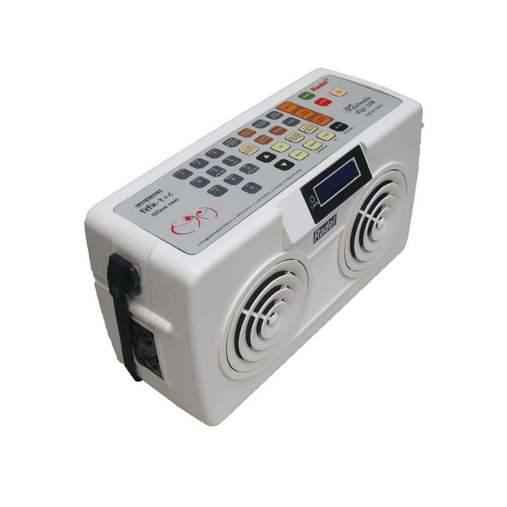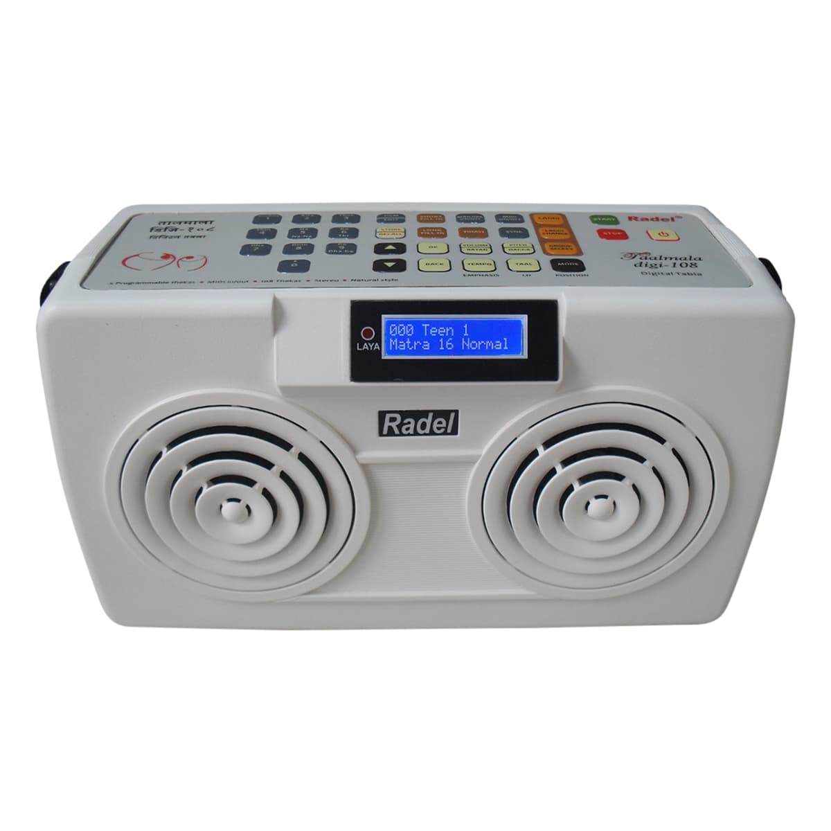Features and Specification: • Live accompaniment mode, manjeera sound, amazing realistic tabla sound using the latest hi-tech sampler technique • Digital display on an attractive blue front-mounted LCD screen • One octave pitch range with fine tuning in between standard settings, 4 settings of dagga depth. Saving of user settings of pitch etc • Intelligently played Long and Short Fill-ins • Sync with Radel Sunadamala lehra • Connect through MIDI to keyboard Synthesizer (MIDI IN and MIDI OUT provided) • Editing of Taals by user • Live accompaniment mode • Manjeera Sound • Digital display on an attractive blue front-mounted LCD screen • One octave pitch range with fine tuning in between standard settings • 4 settings of dagga depth • Saving of user settings of pitch etc • Intelligently played Long and Short Fill-ins • Sync with Radel Sunadamala lehra • Connect through MIDI to keyboard Synthesizer (MIDI IN and MIDI OUT provided) • Editing of Taals by user • User can create 5 new thekas of 99 matras each • Housed in a sleek, lightweight ABS cabinet (size: 230mm x 135mm x 90mm, weight: approx 1kg)